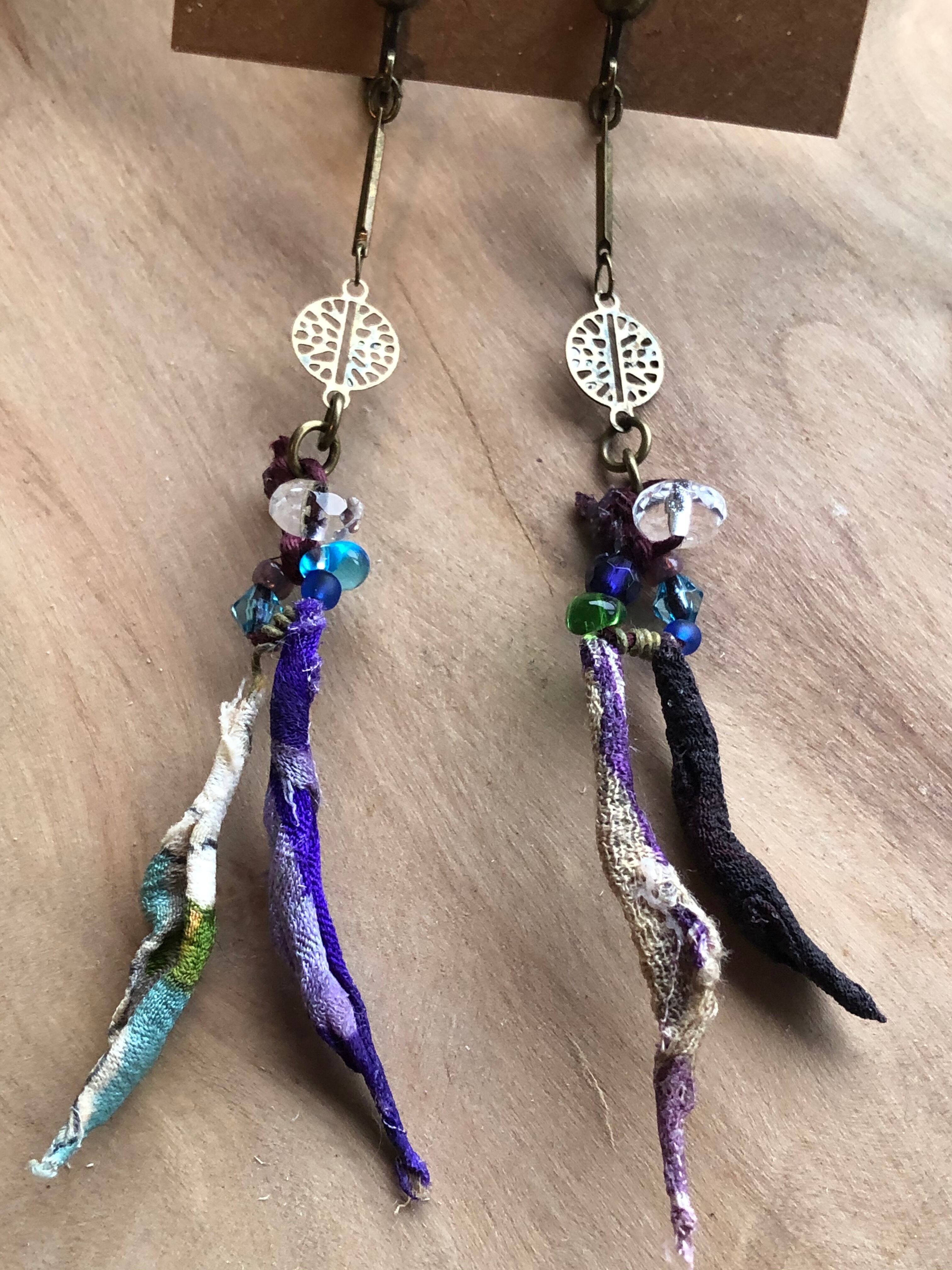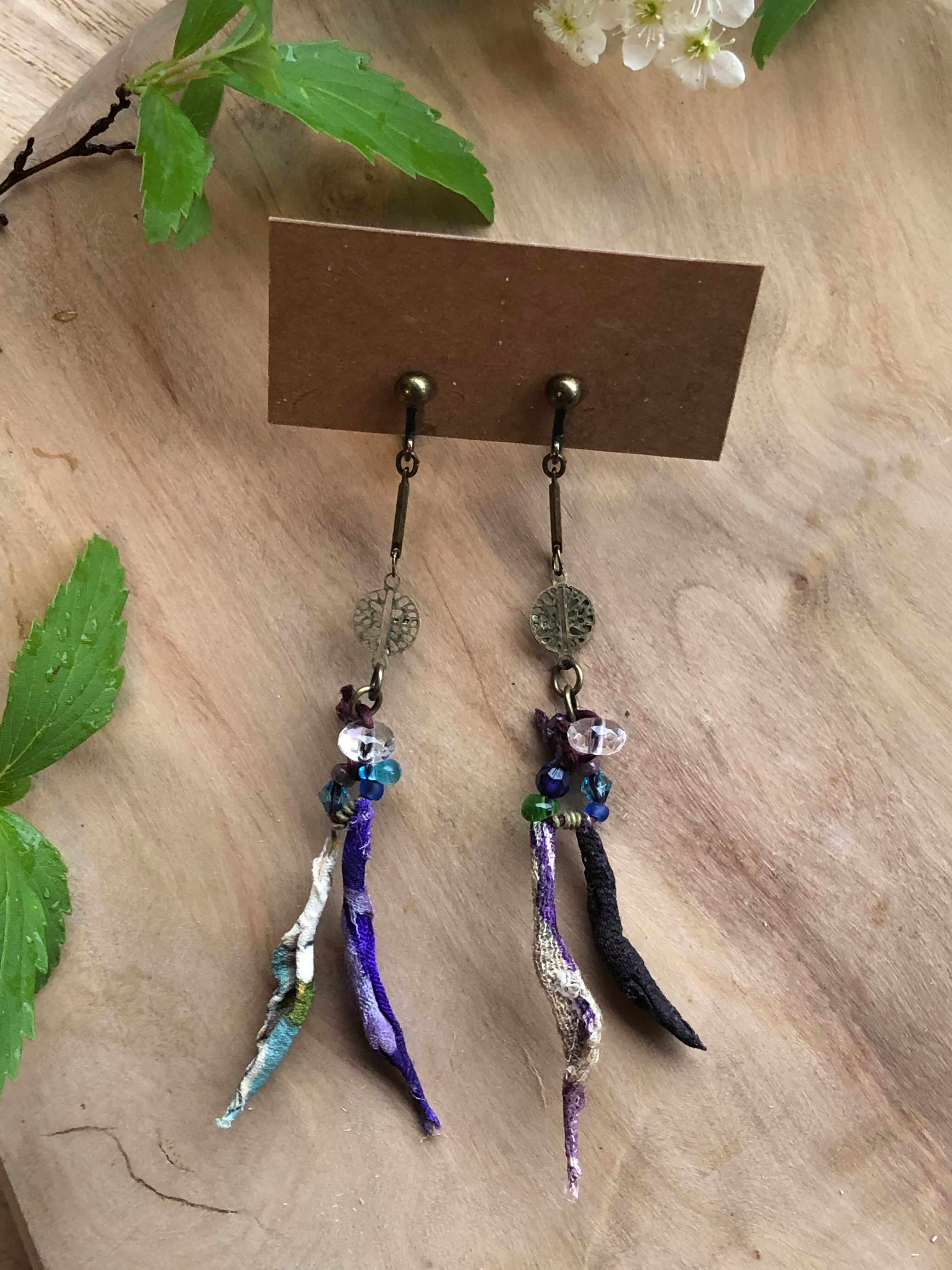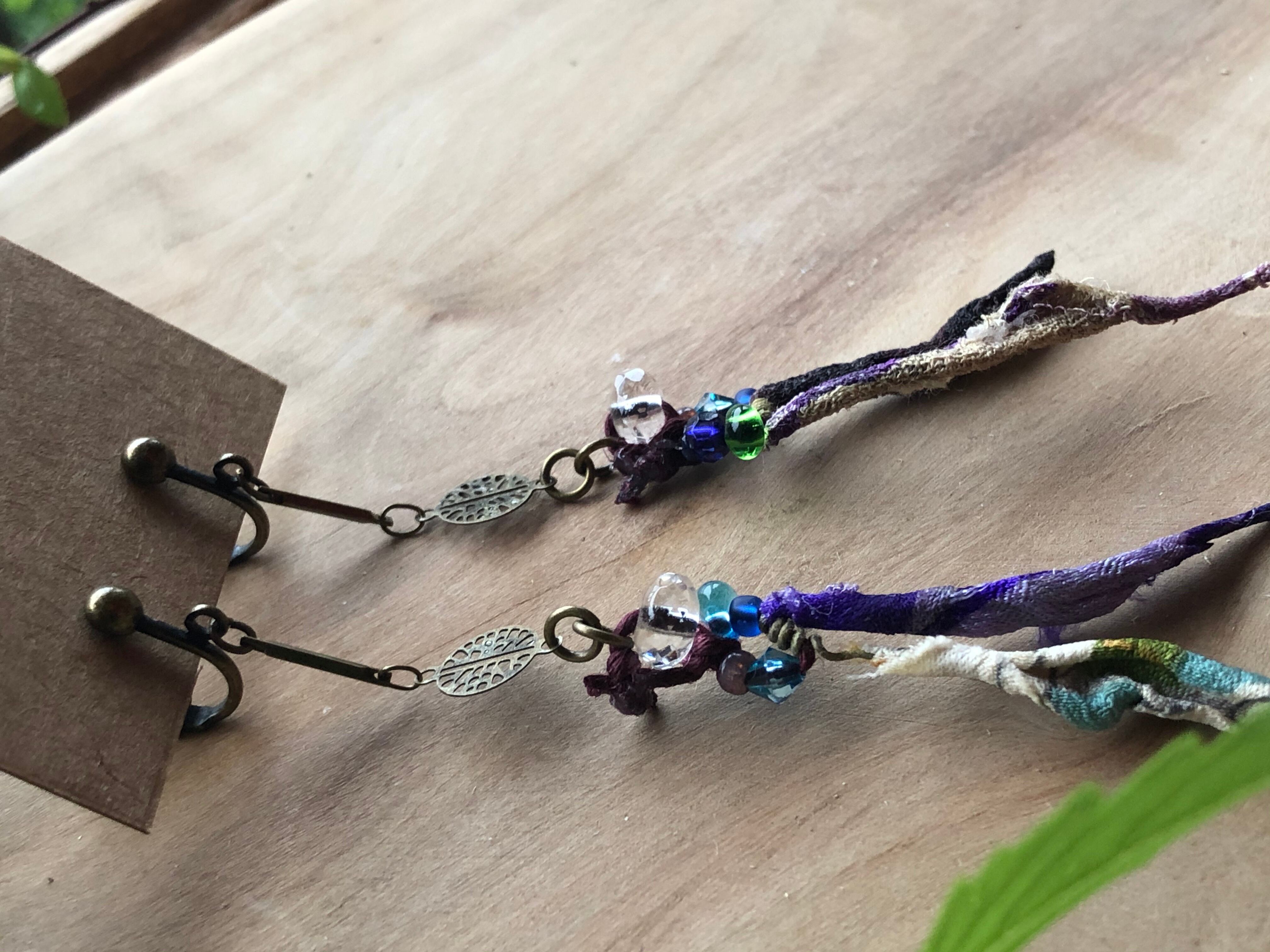 アンティーク縮緬(ちりめん)とガラスビーズ、透かしパーツを使った、付けているのを忘れるぐらいの軽く涼しげなデザイン。