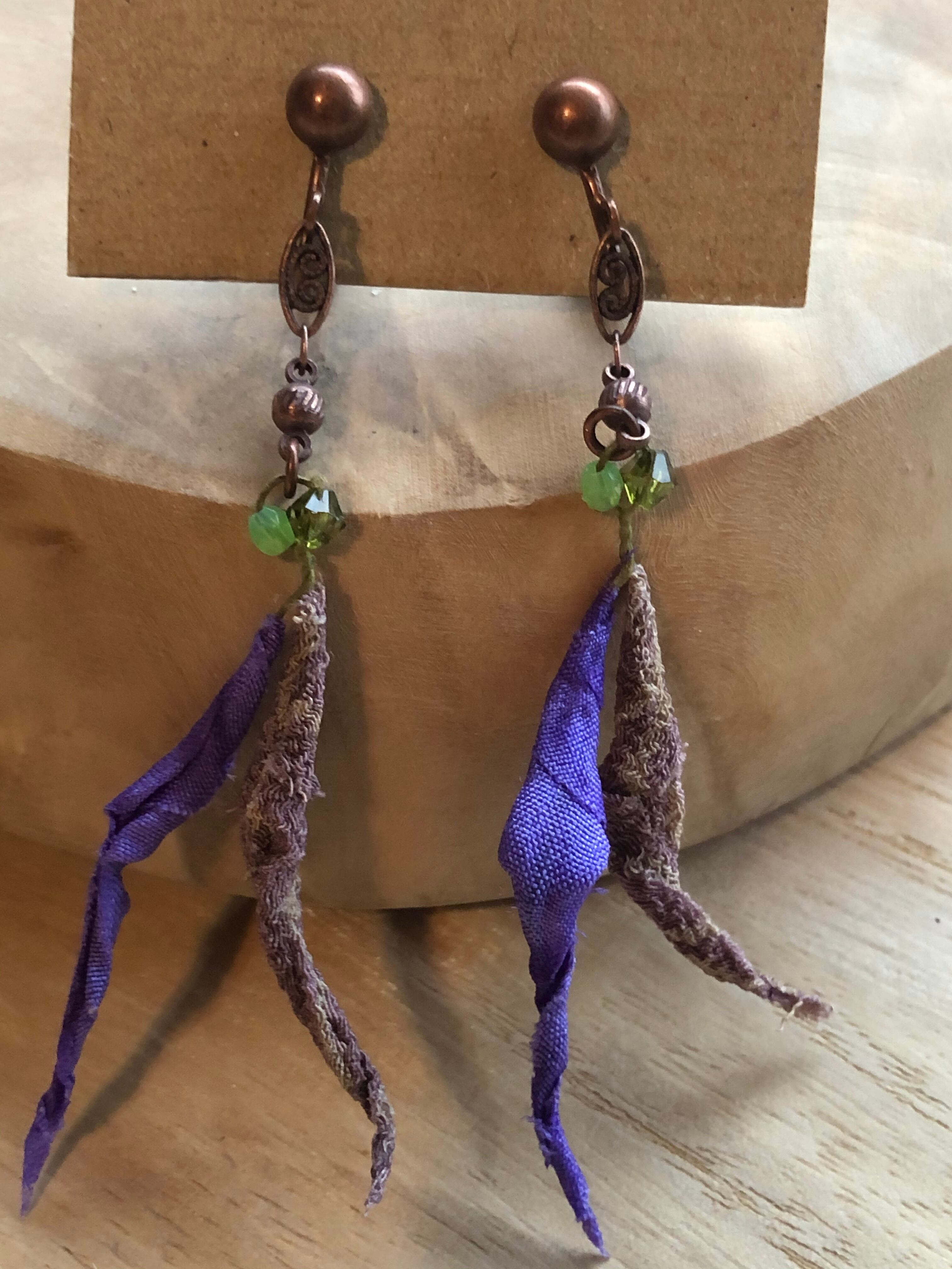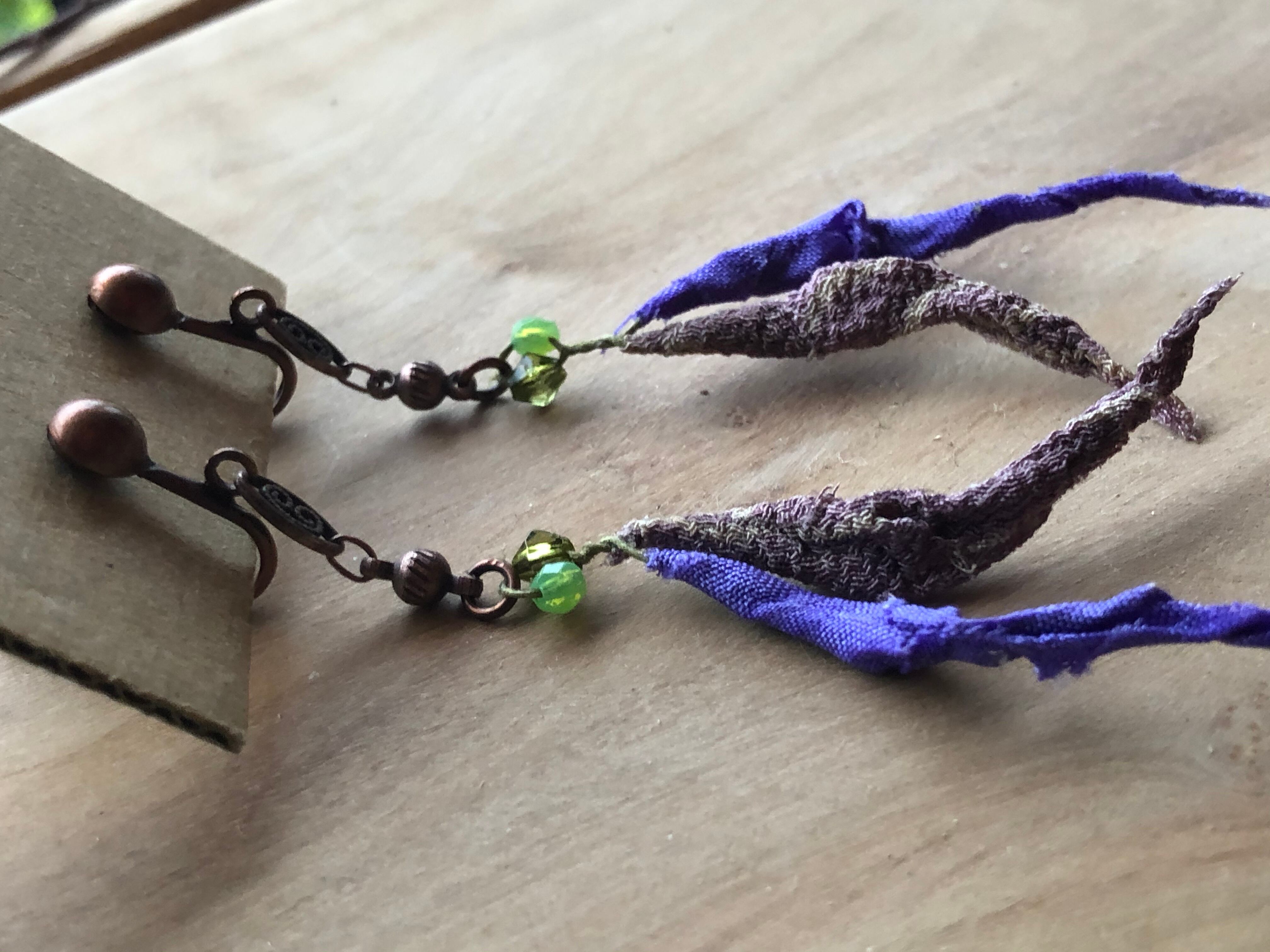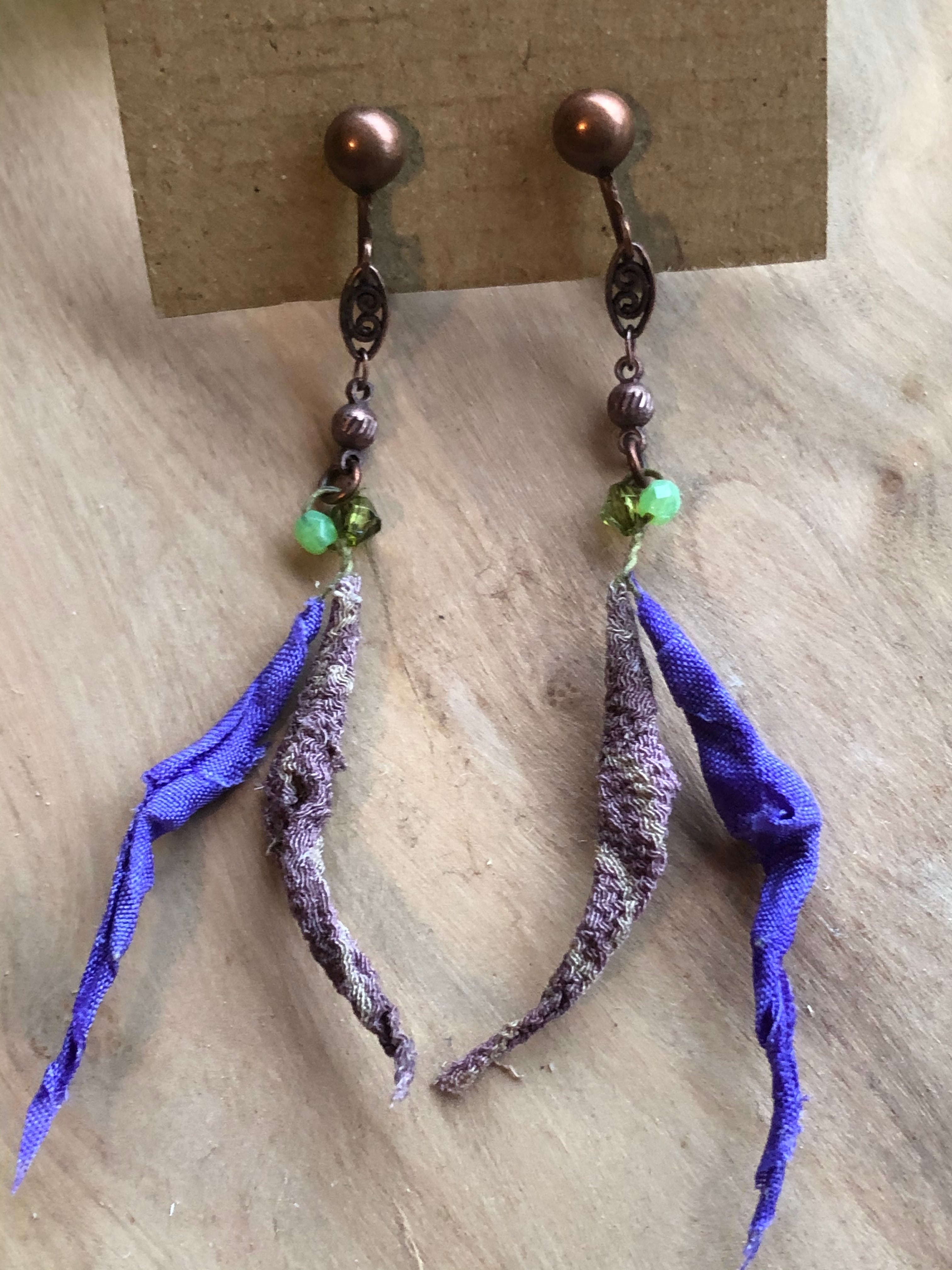 アンティーク縮緬(ちりめん)とガラスビーズ、透かしパーツを使った、付けているのを忘れるぐらいの軽く涼しげなデザイン。