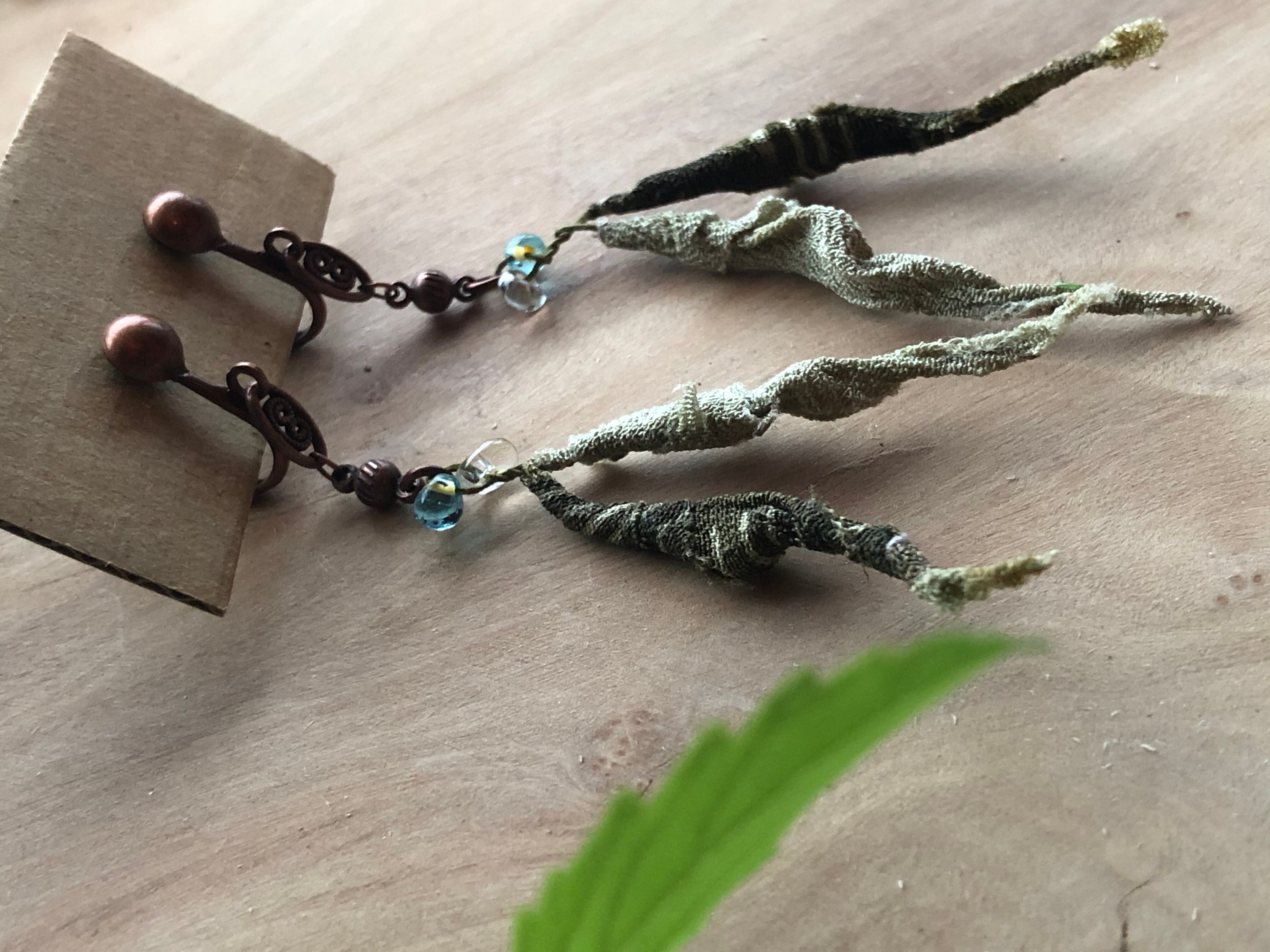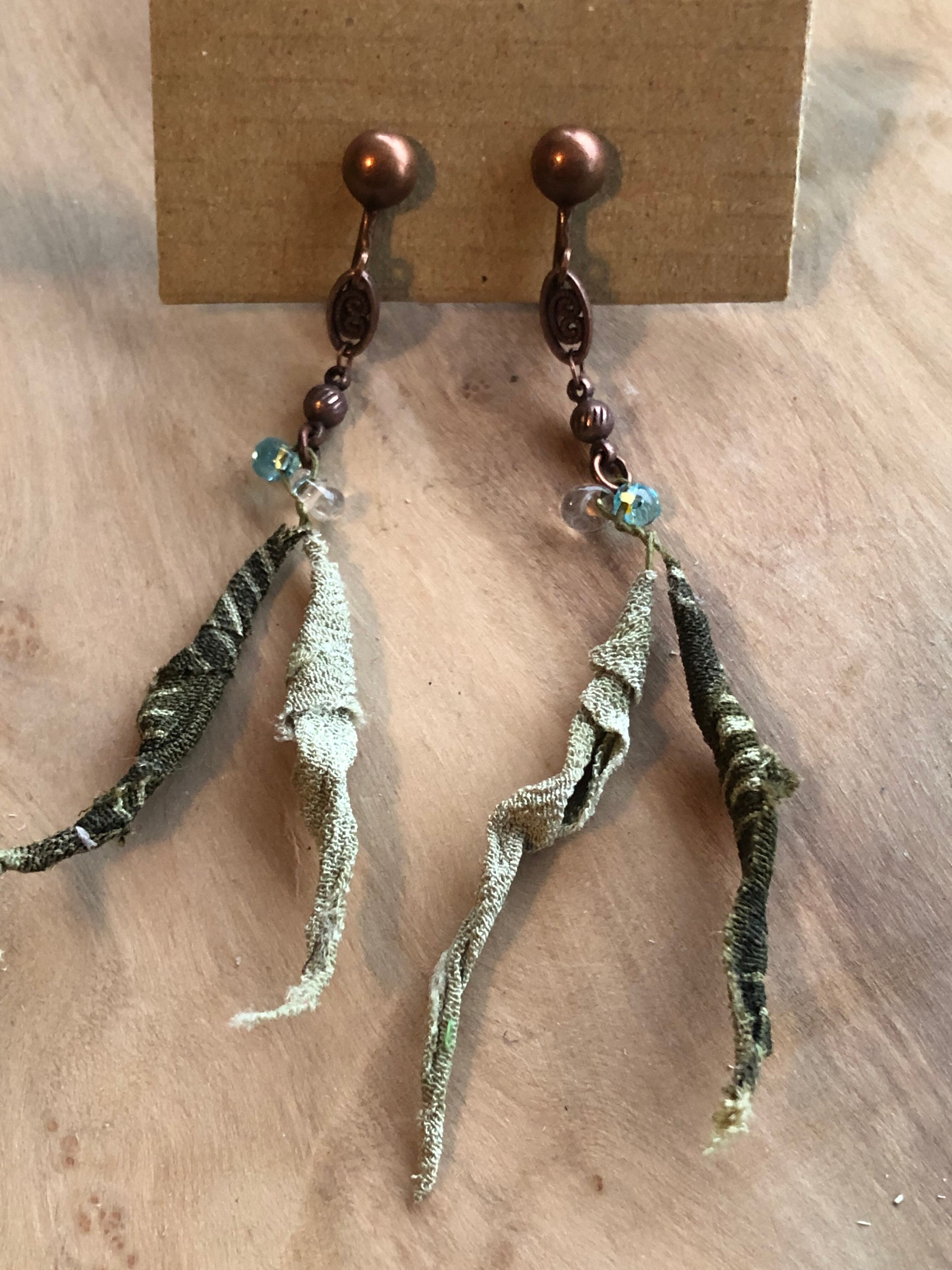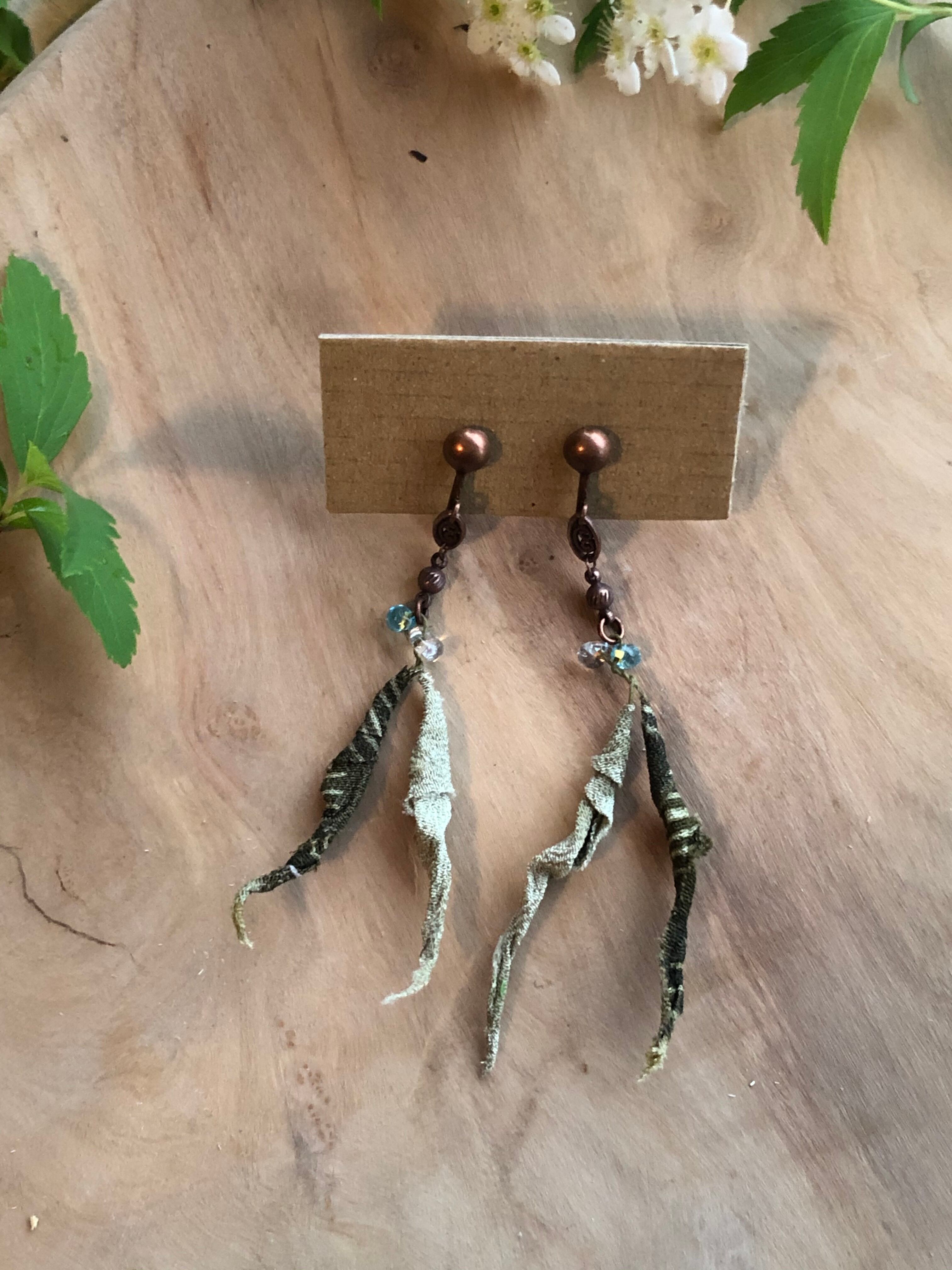 アンティーク縮緬(ちりめん)とガラスビーズ、透かしパーツを使った、付けているのを忘れるぐらいの軽く涼しげなデザイン。