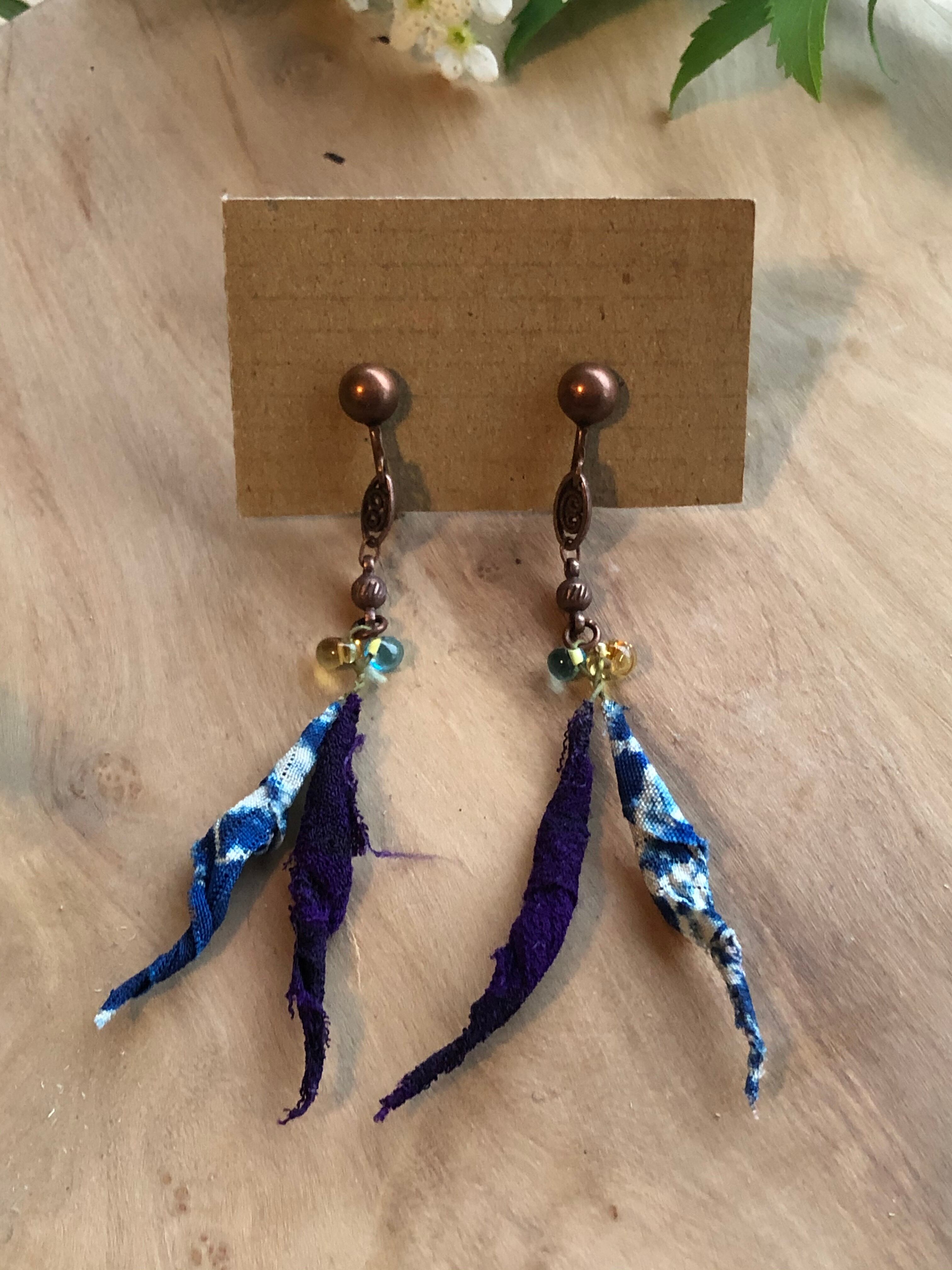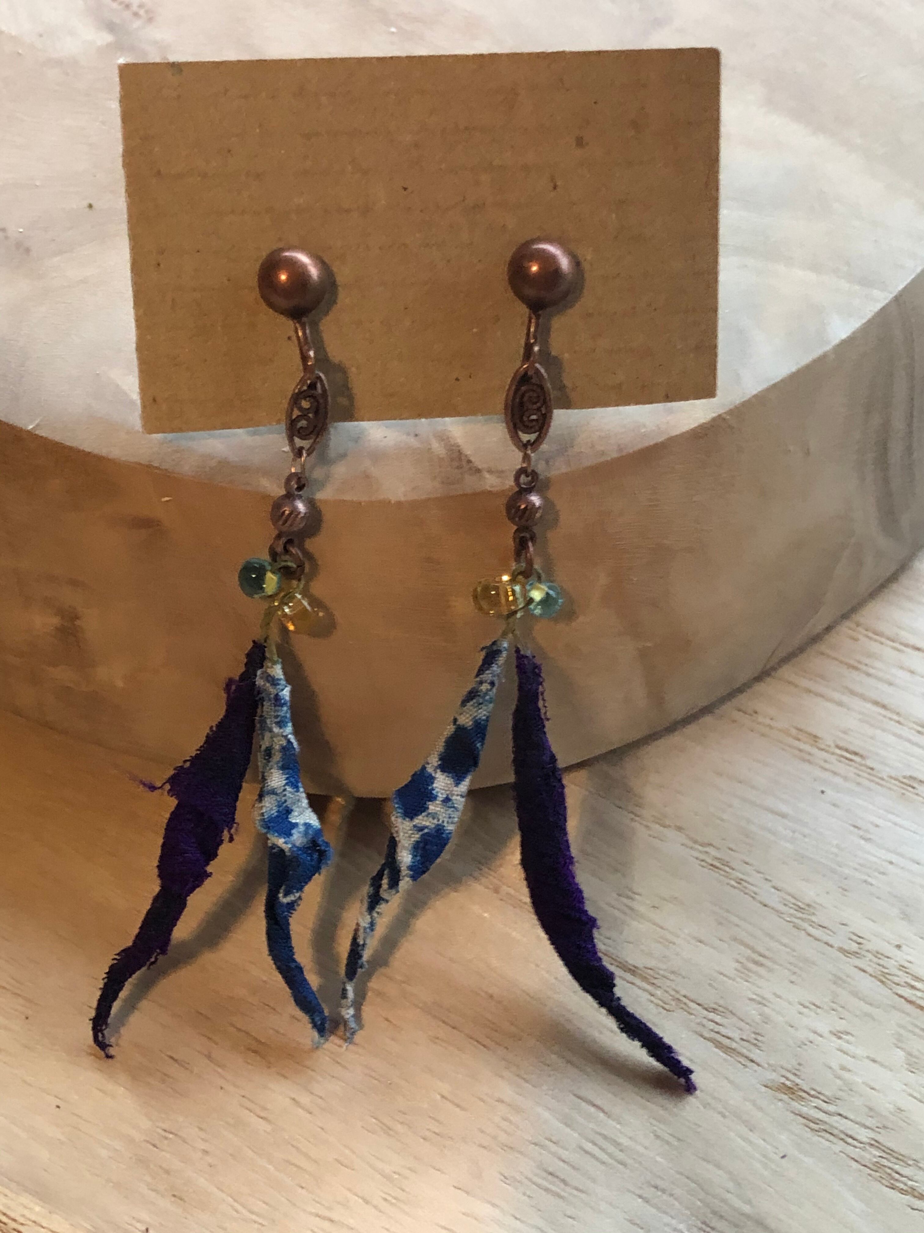 アンティーク縮緬(ちりめん)とガラスビーズ、透かしパーツを使った、付けているのを忘れるぐらいの軽く涼しげなデザイン。