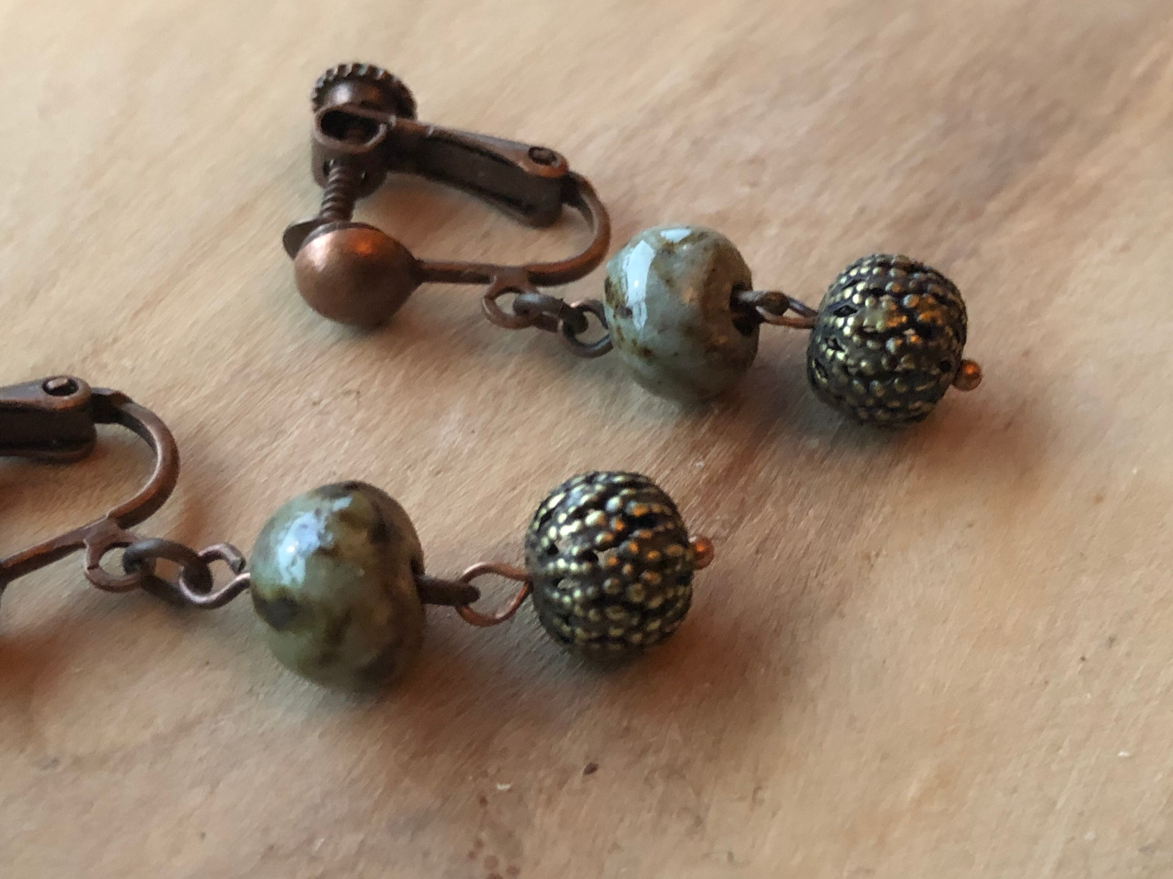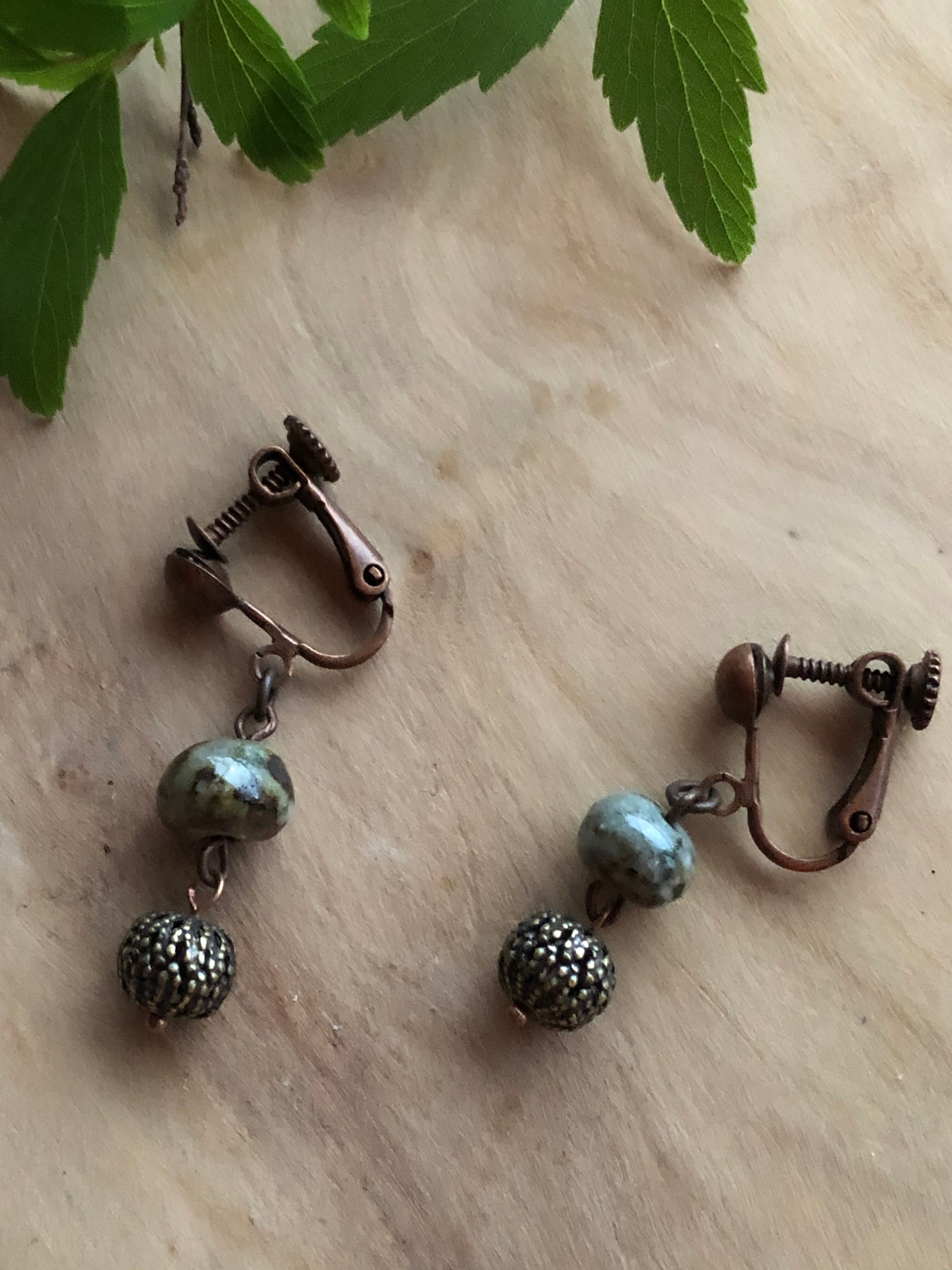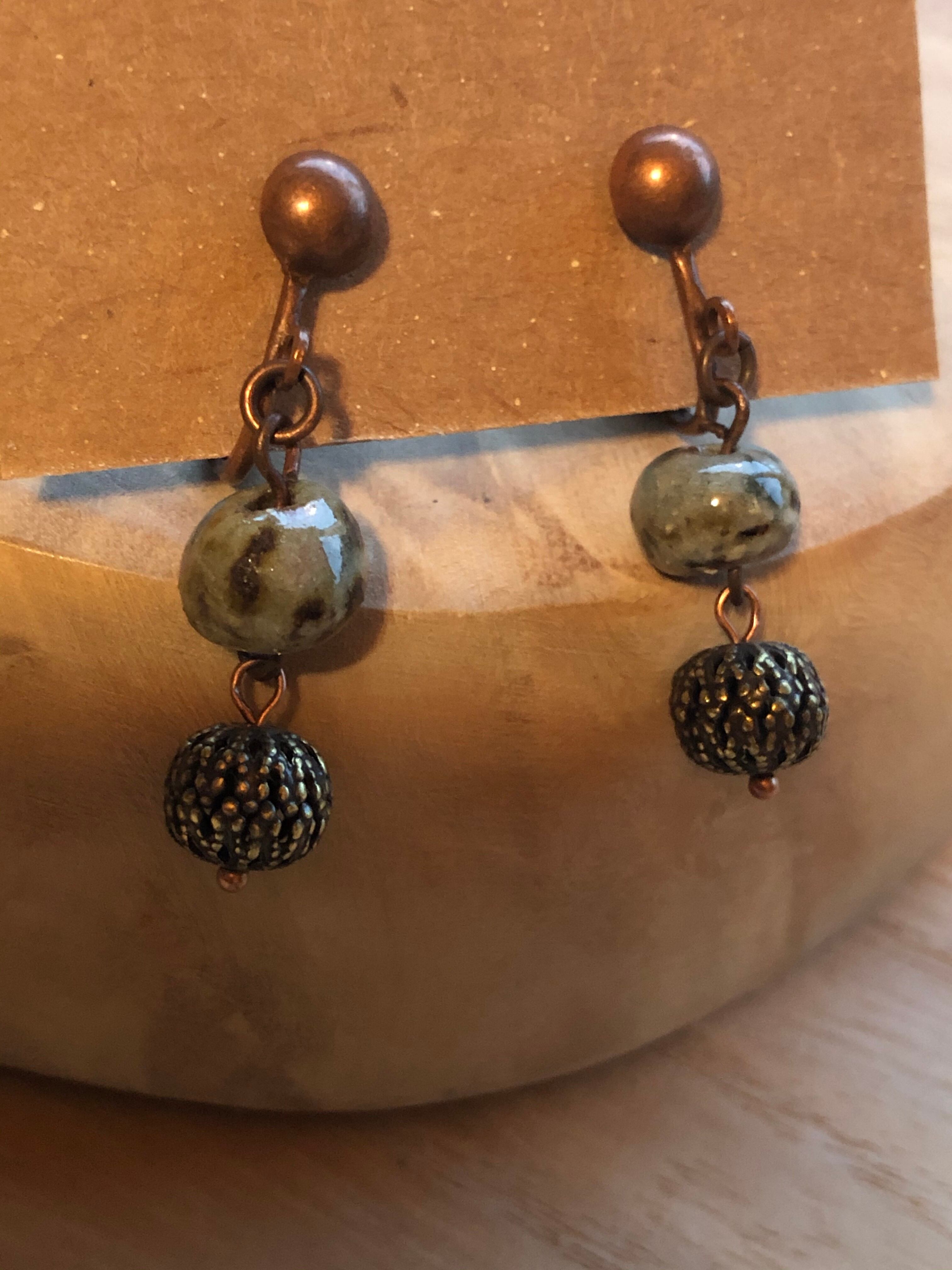 灰釉という釉薬をかけた味わいのある陶玉と、透かし玉を繋いだシックなイヤリング。