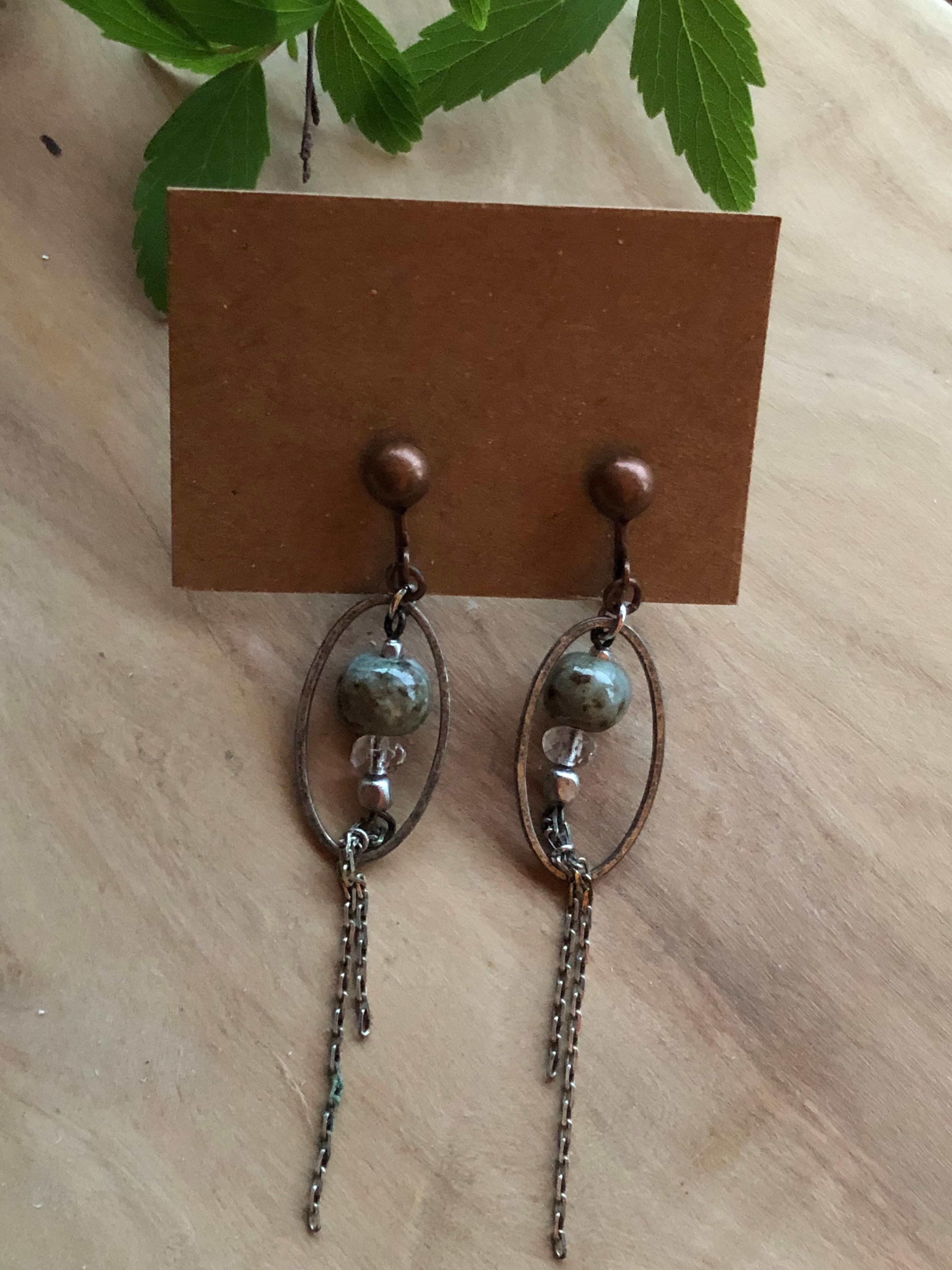 灰釉玉をアンティークなシルバーメッキリングとチェーン、ガラスビーズを合わせた大人っぽいデザイン。