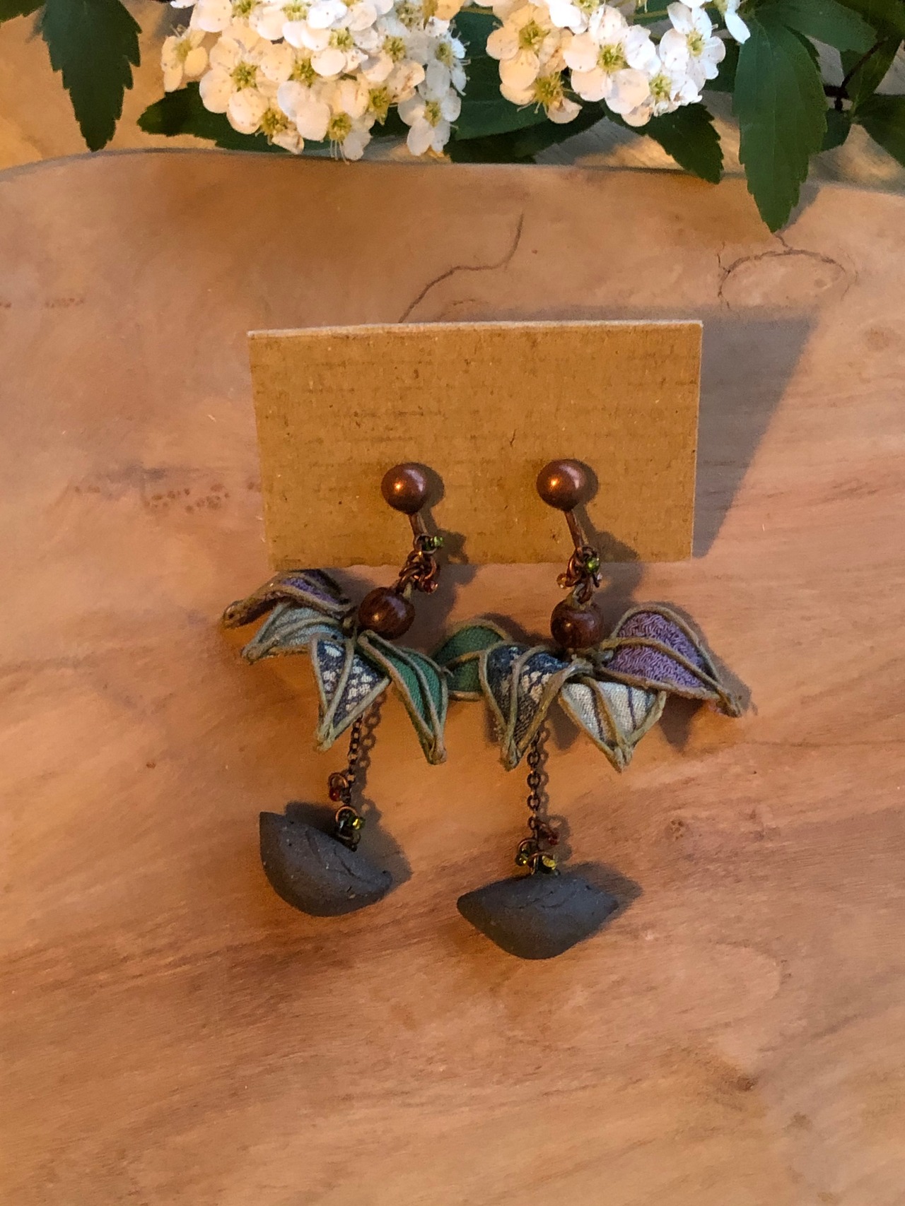 ワイヤーとアンティーク縮緬布で作った雰囲気のある笹の葉パーツに、絵付したやきものパーツや、黒土で焼き締めた小鳥のパーツが揺れる、オリジナリティ溢れる個性的デザイン。