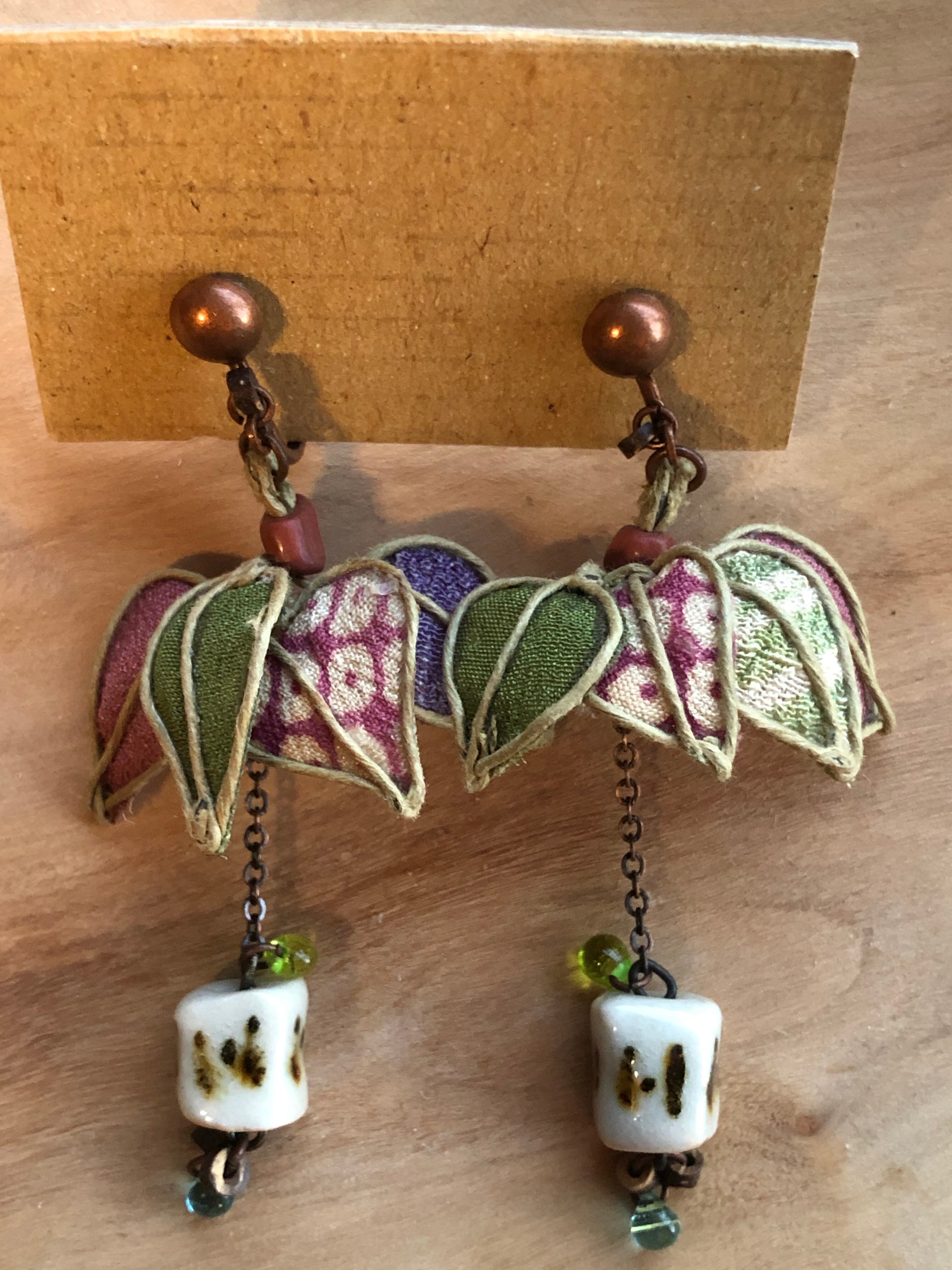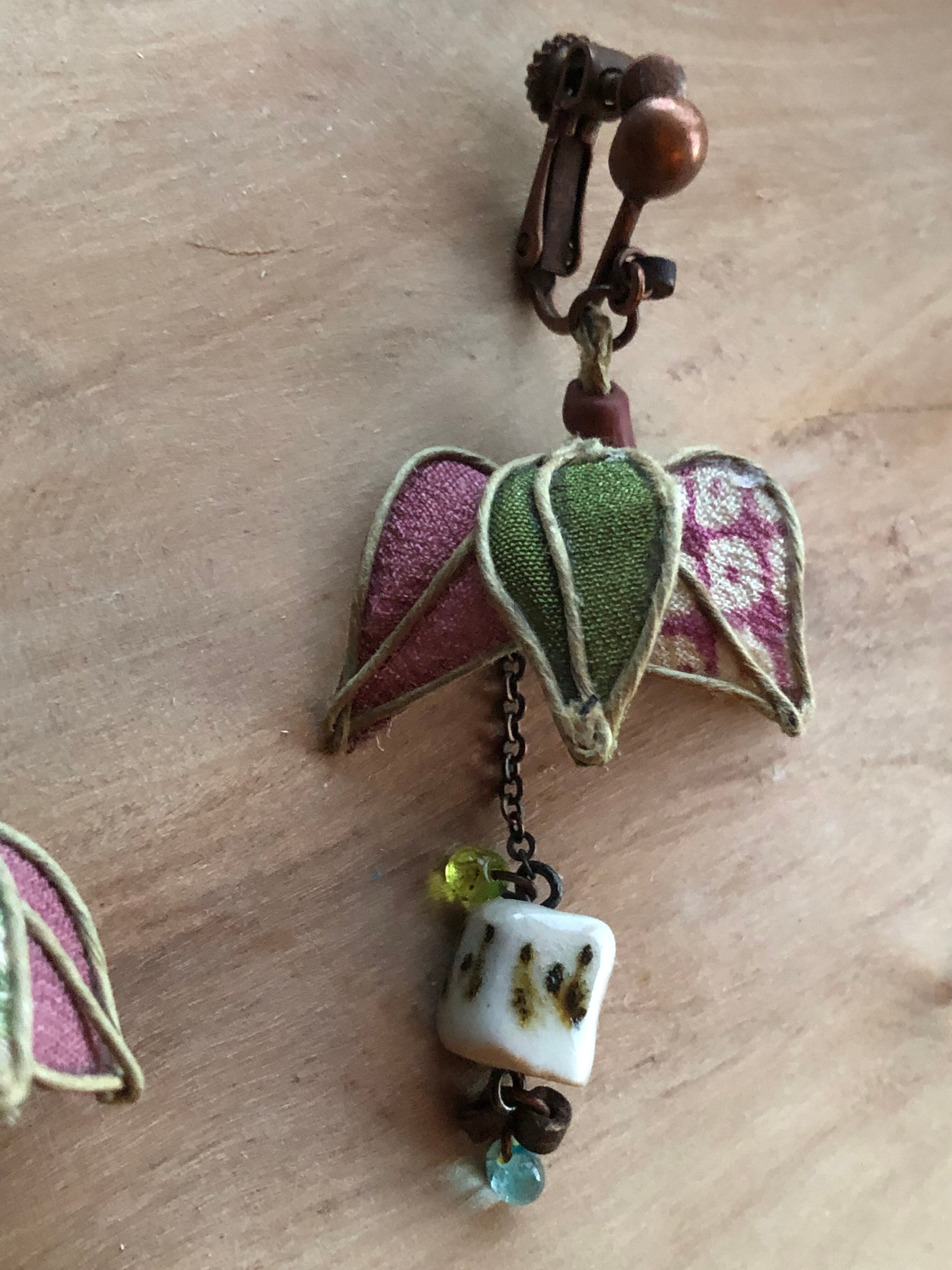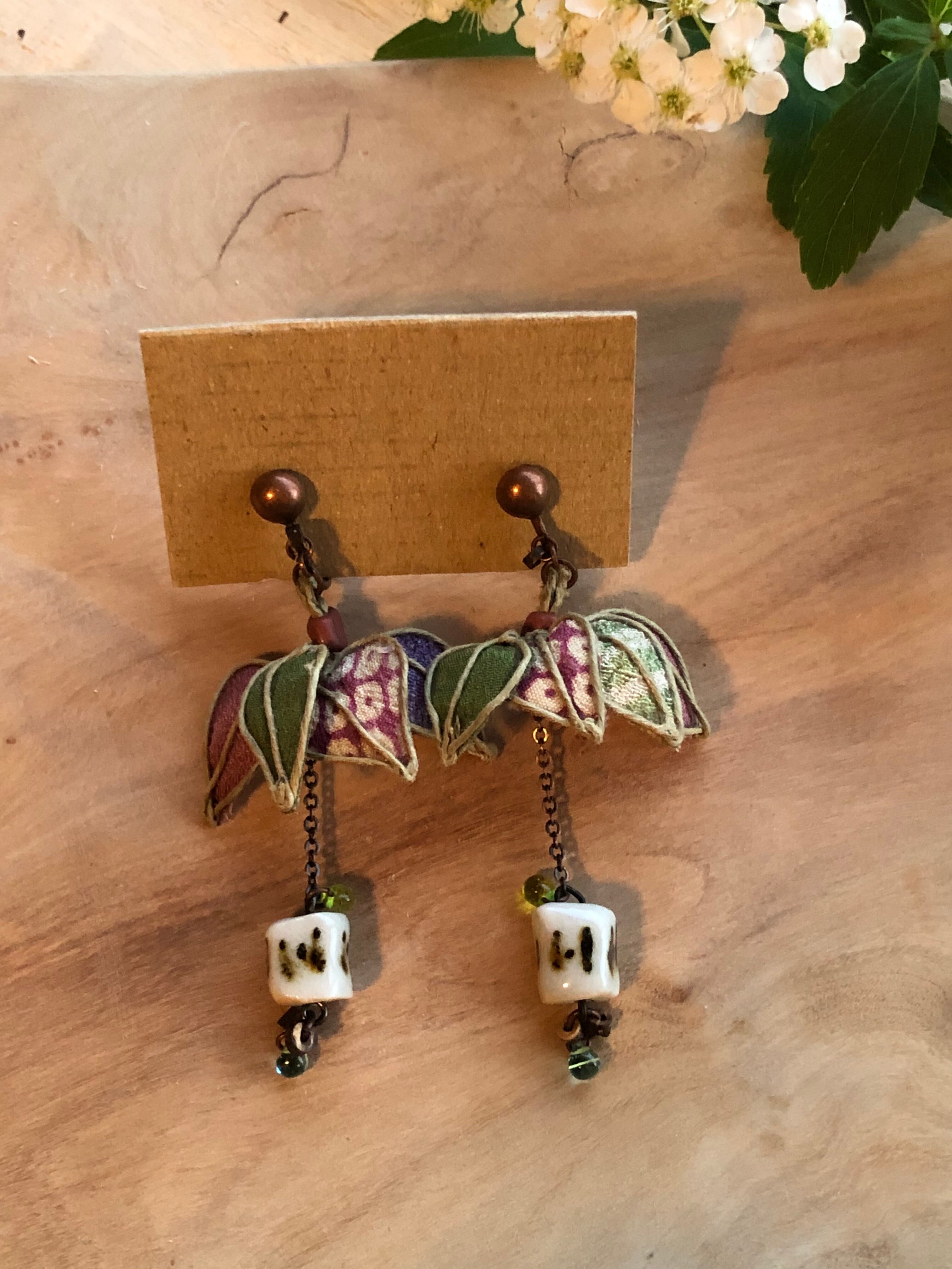 ワイヤーとアンティーク縮緬布で作った雰囲気のある笹の葉パーツに、絵付したやきものパーツや、黒土で焼き締めた小鳥のパーツが揺れる、オリジナリティ溢れる個性的デザイン。