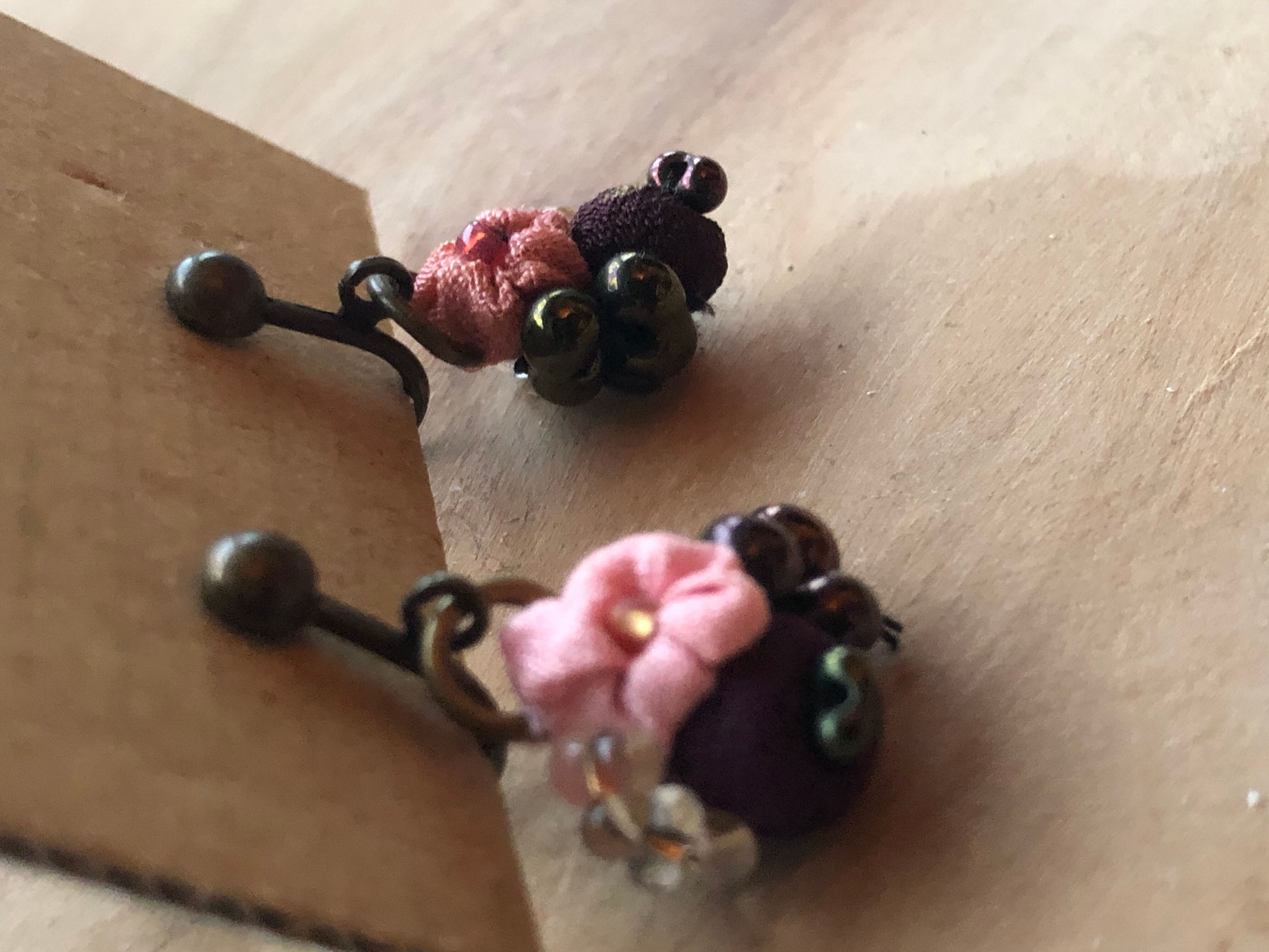 縮緬、絣、大島紬等を玉虫色メタリックビーズと、チクチク縫って創った可愛らしいオリジナル。