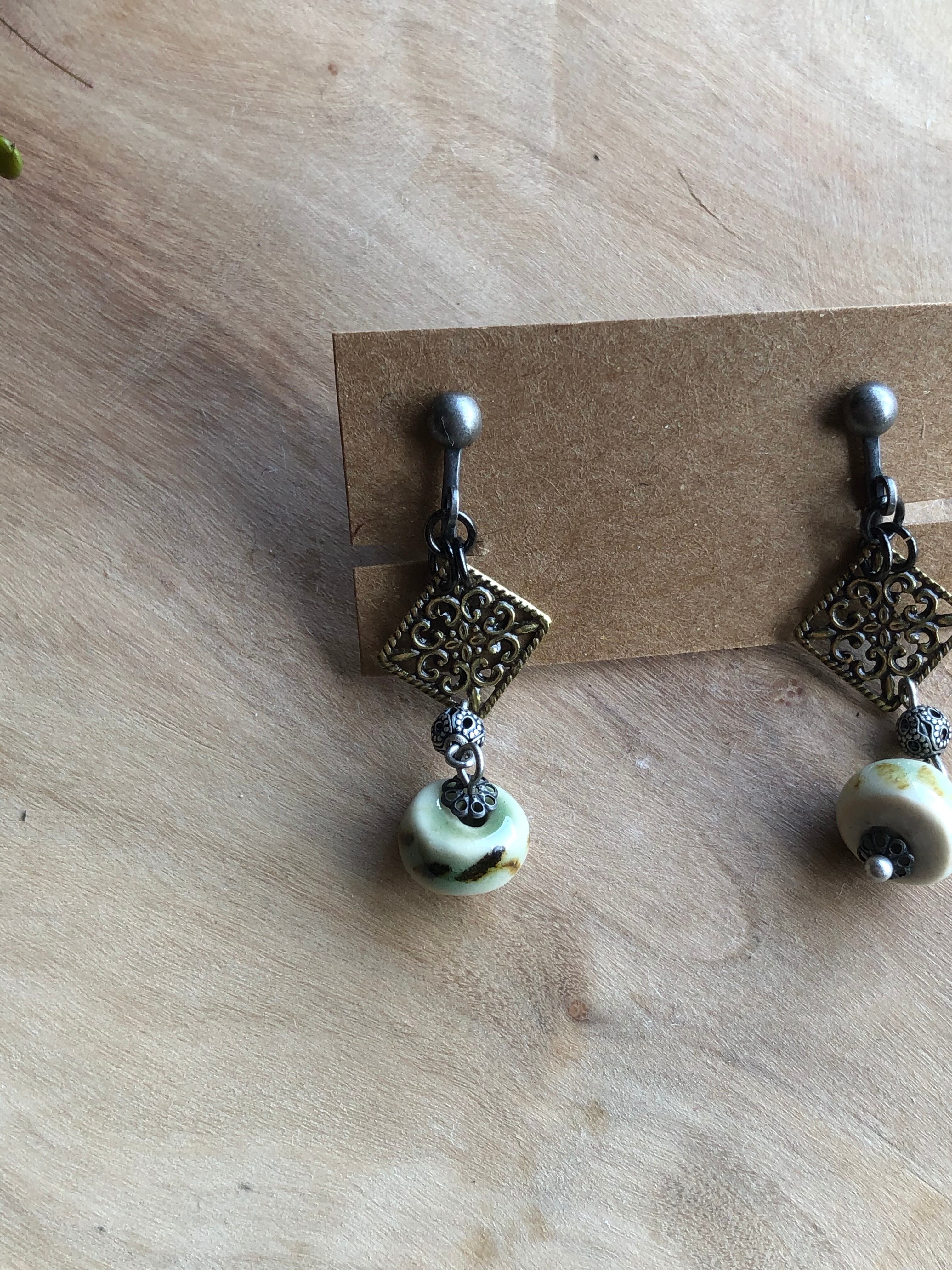 サビ色メタルの透かし板に緑の織部釉を掛け流し、鉄で絵付けした小さな玉を下げました。