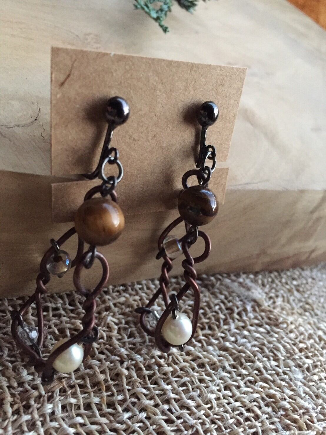 銅アルミワイヤーの中に天然石(タイガーアイ.8㎜)やパールを編み込んだ個性的ながら、合わせやすいイヤリング