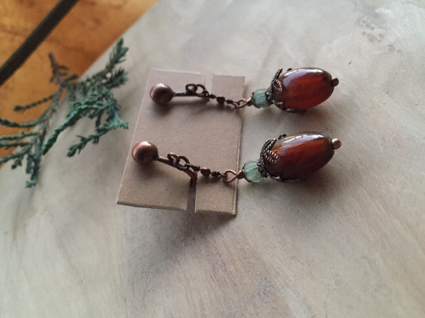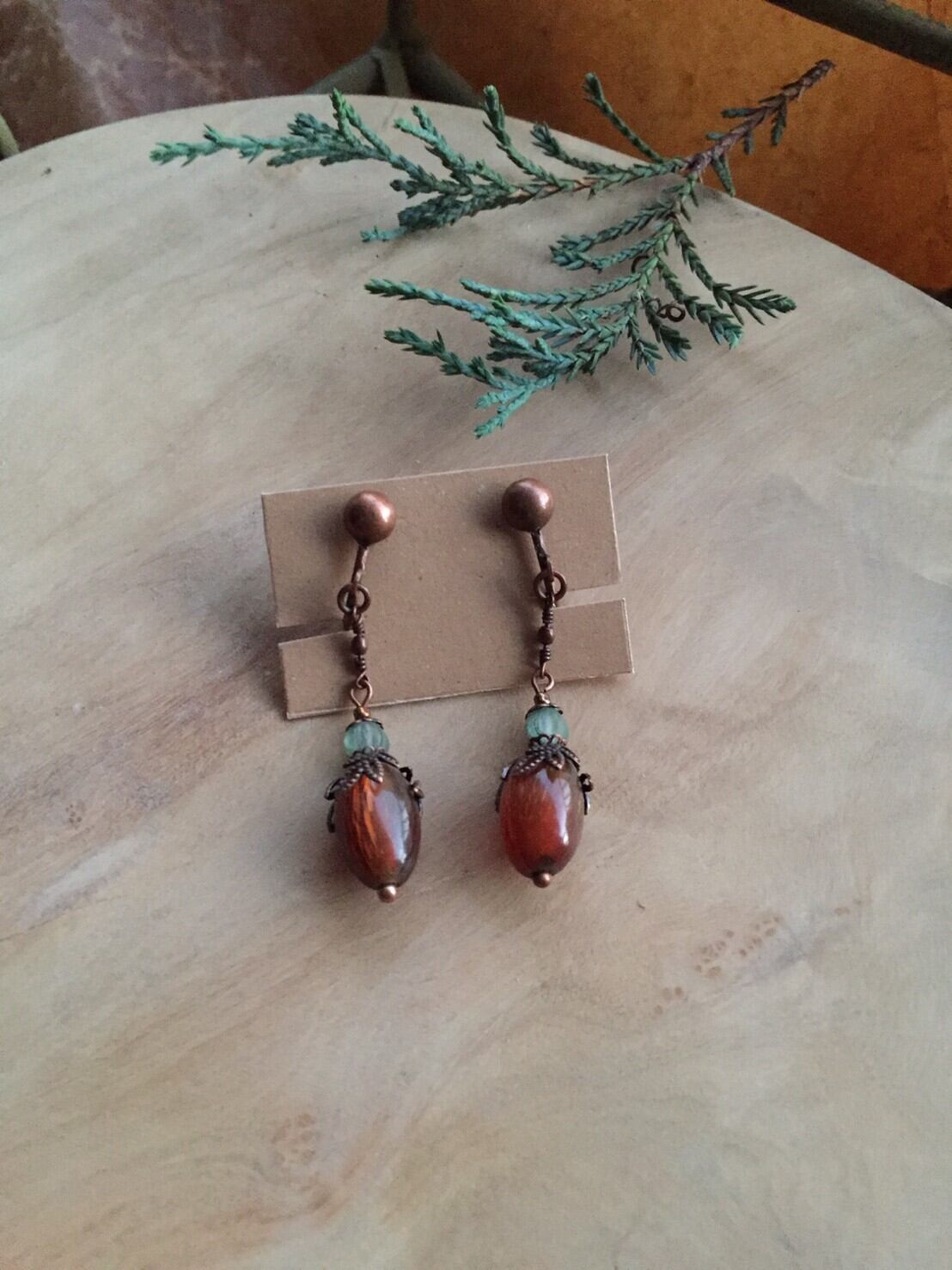 飴玉のような深い色味のねり玉にメタルキャップを合わせ、薄グリーンのガラス玉を組み合わせたイヤリング