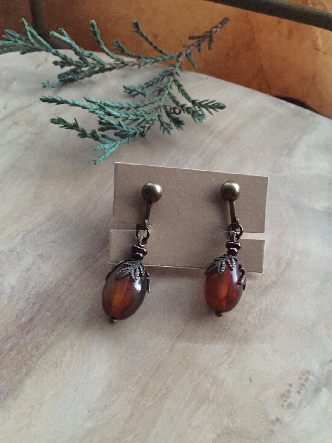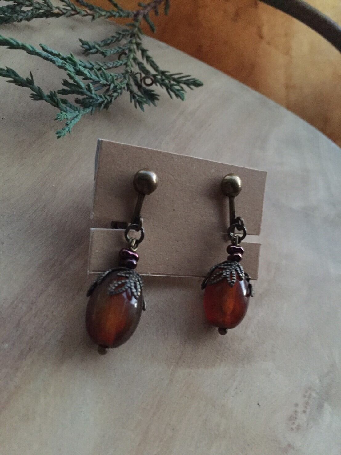 飴玉のような深い色味のねり玉にメタルキャップを合わせた、どんぐりを思わせる、合わせやすいイヤリング