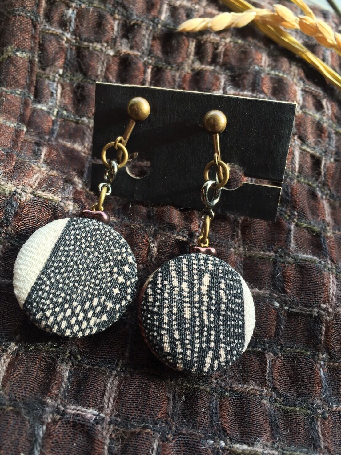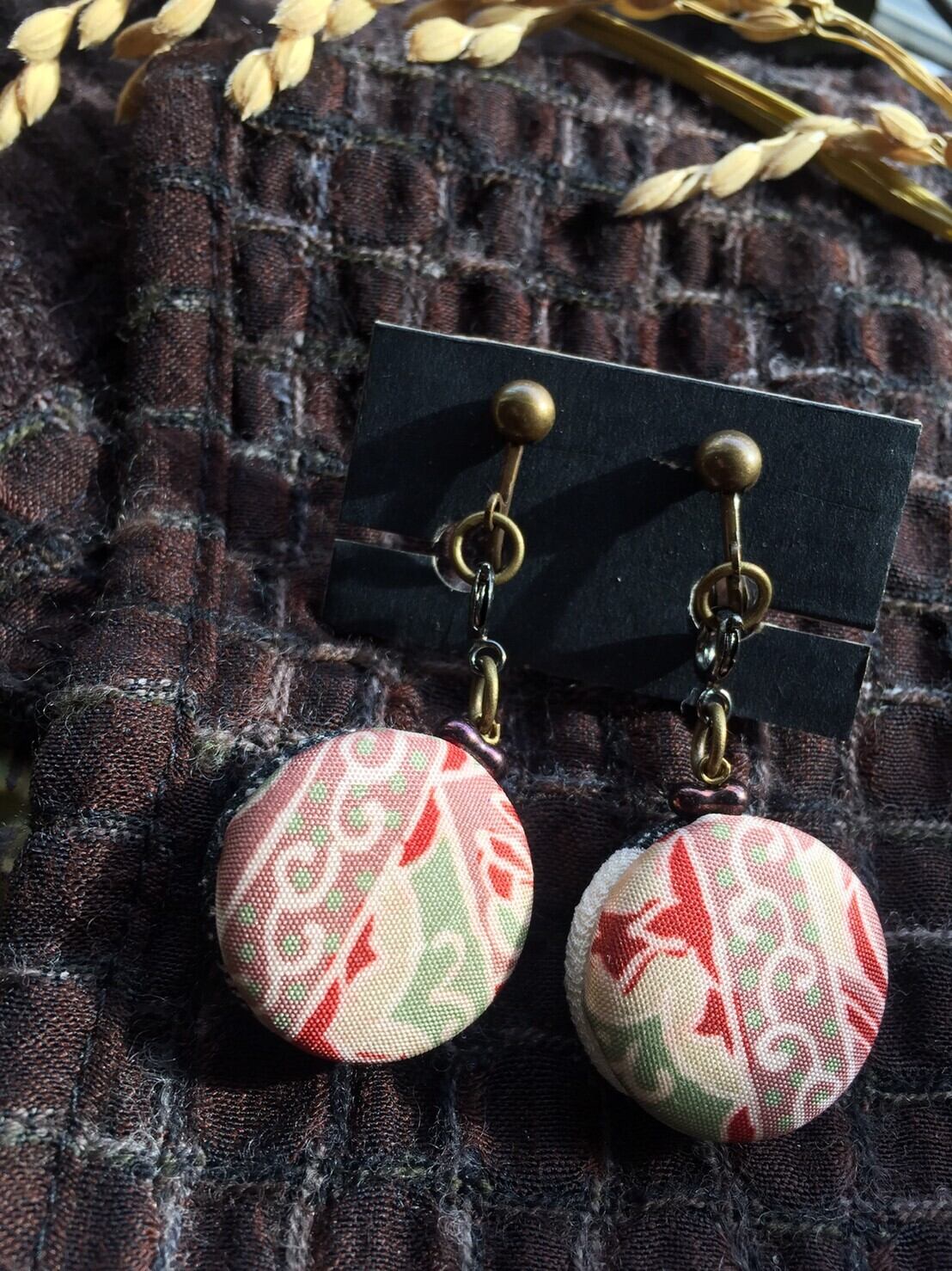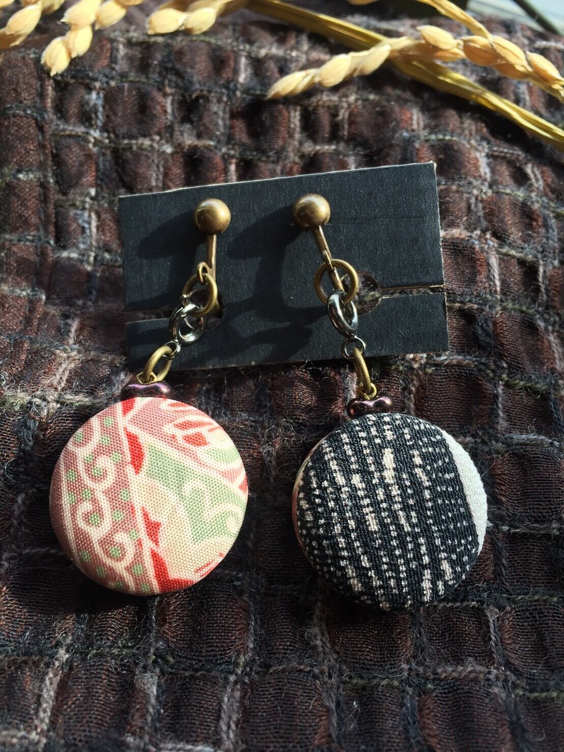 古布縮緬のくるみボタン(23㎜×高11㎜)をワンタッチで付け替えられて、リバーシブルで使える、とってもお得感のあるイヤリング